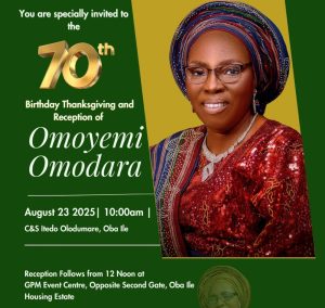 You are specially and warmly invited to the 70th Birthday Thanksgiving and Reception in honour of Omoyemi Omodara, a woman of grace, strength, and enduring faith.
