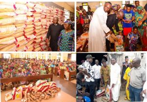 The beneficiaries were presented with bags of rice and tubers of yam as part of efforts to ease their hardship during the Christmas and New Year celebrations.